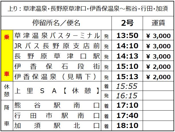 加須駅・行田市駅・熊谷駅~伊香保温泉・草津温泉 投稿者: mysmrt | 2025年10月31日 0件のコメント 路線図 時刻表・運賃 毎日運行 2026年01月01日運賃改定2025年11月01日停留所追加2024年01月20日運行開始